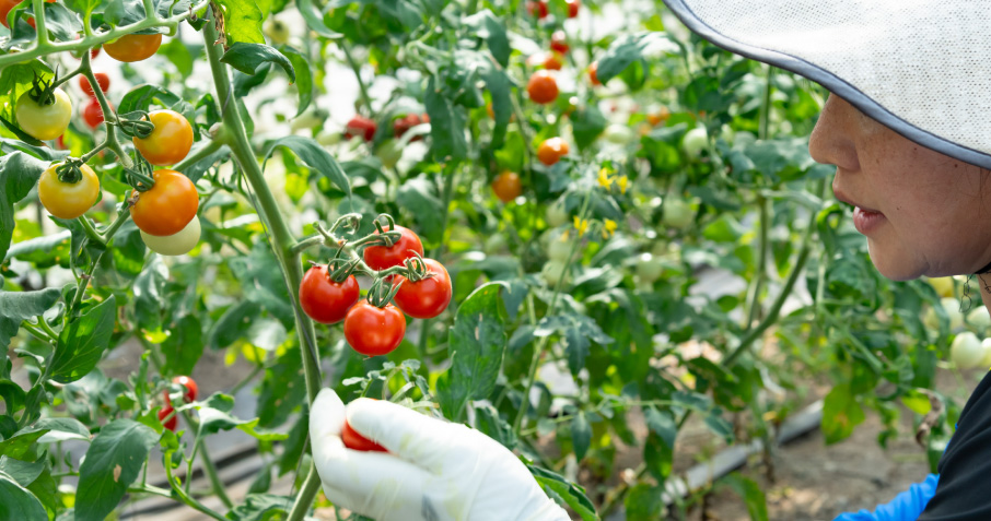 神谷農園では女性スタッフが中心となり、丹精込めて野菜やきのこを栽培しています。おもにミディトマトときくらげを栽培し、とれたての新鮮な美味しさをお届けしています。