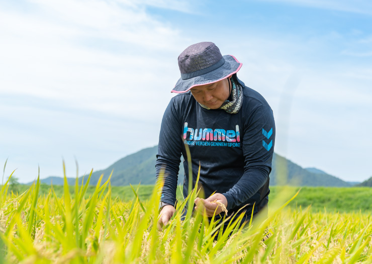 私たちが親方から受け継いだ農業は、「一つひとつの仕事をていねいに行うこと」が基本です。土づくりは田んぼごとに状態を見極め、肥料や稲を元気にする土づくり資材の量を調節。土質に適した品種を作付け、病気に気を付けながら大切に世話をしています。また、野菜作りでは米を収穫した際に出る籾殻や米ぬかで作った堆肥を使用しており、生かせるものはできる限り無駄にせず循環させ、次の実りにつなげるよう心がけています。
