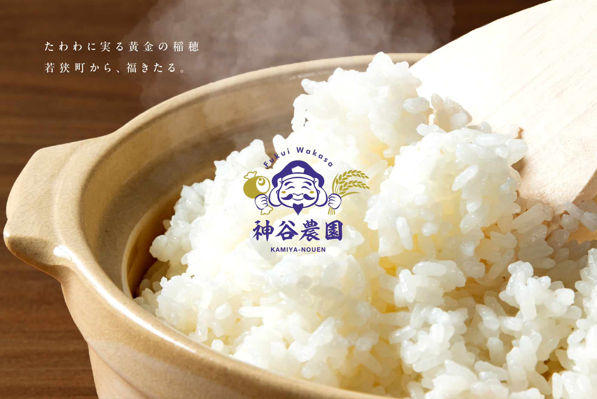 神谷農園では、この若狭町の清らかな水をたっぷりと使い、美味しい米や野菜を育てています。特に米は、昼と夜の寒暖差が大きいほど、粘りや甘みの強い米になります。田んぼでは、豊富な水を生かした水管理を行い、日中は太陽の光をいっぱいに浴び、夜は流水の冷たさにより、旨味のもとを蓄えながら、美味しい米を育てています。